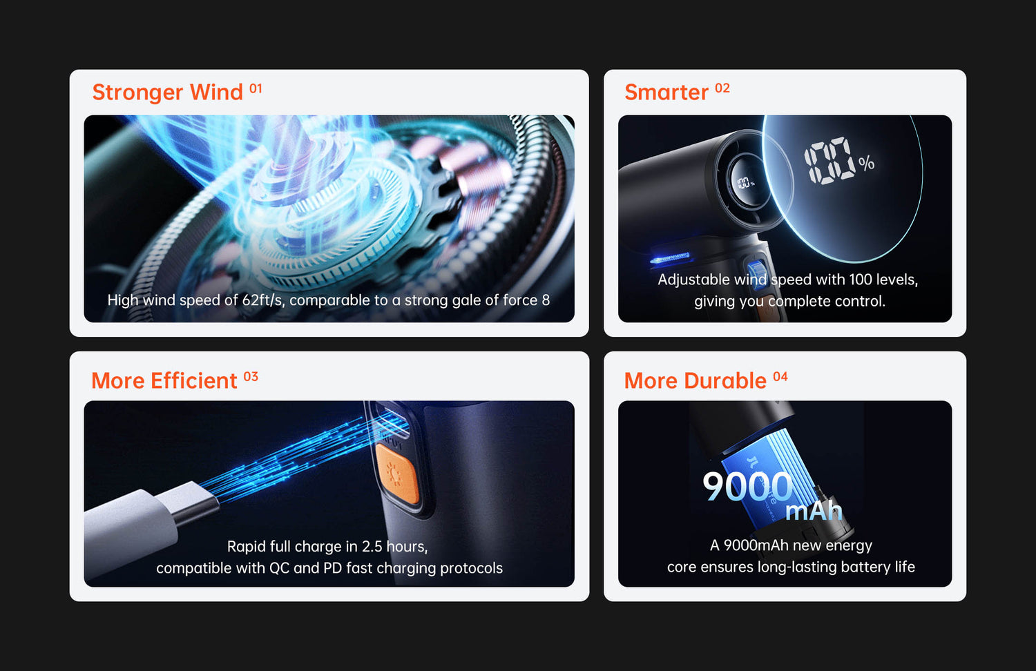 - Powerful Airflow: Despite its compact size, this handheld fan delivers a surprising airflow of 19m/s. With 100 adjustable speed settings, you can control the fan's intensity to ensure you get the cooling effect you desire.